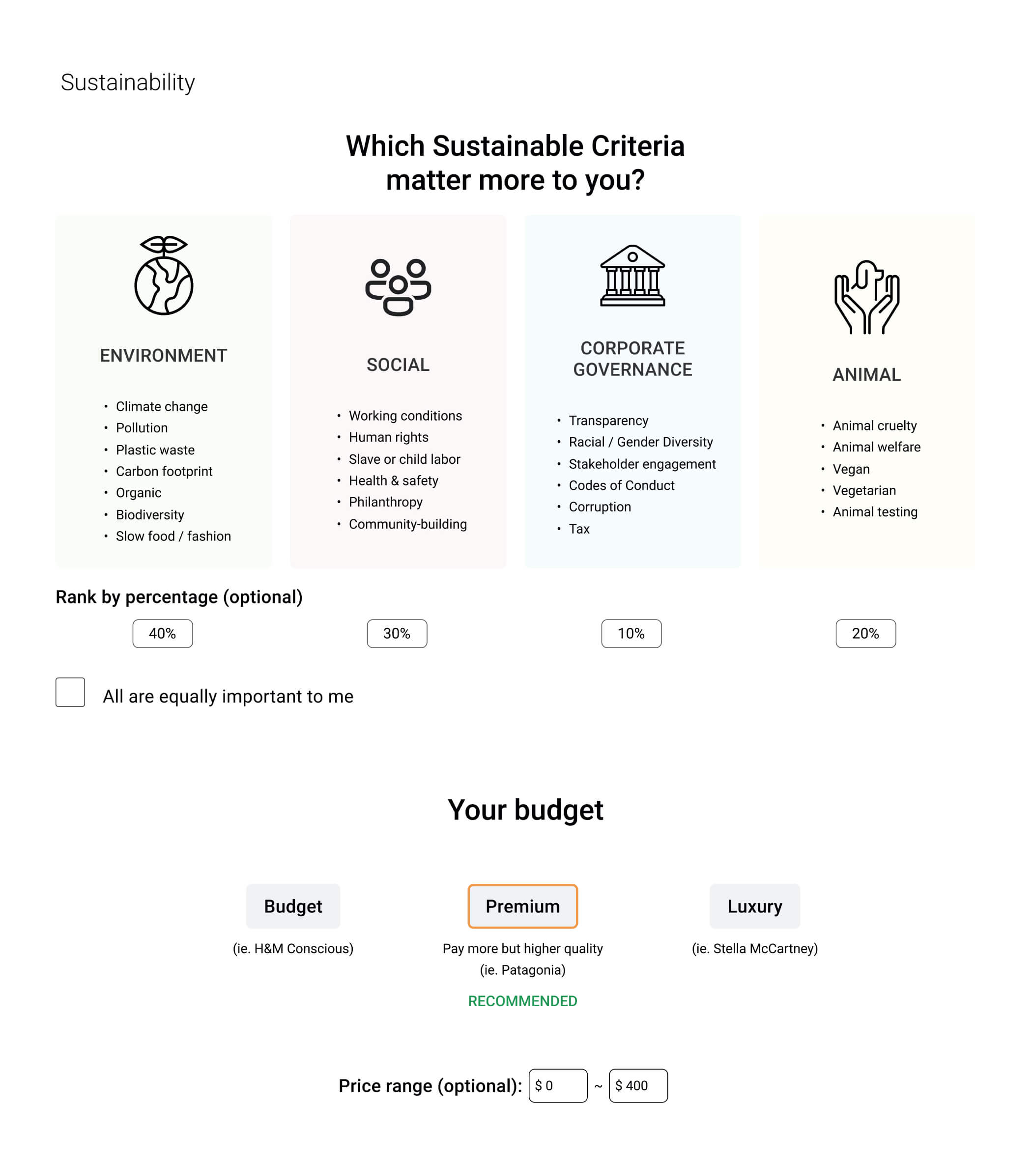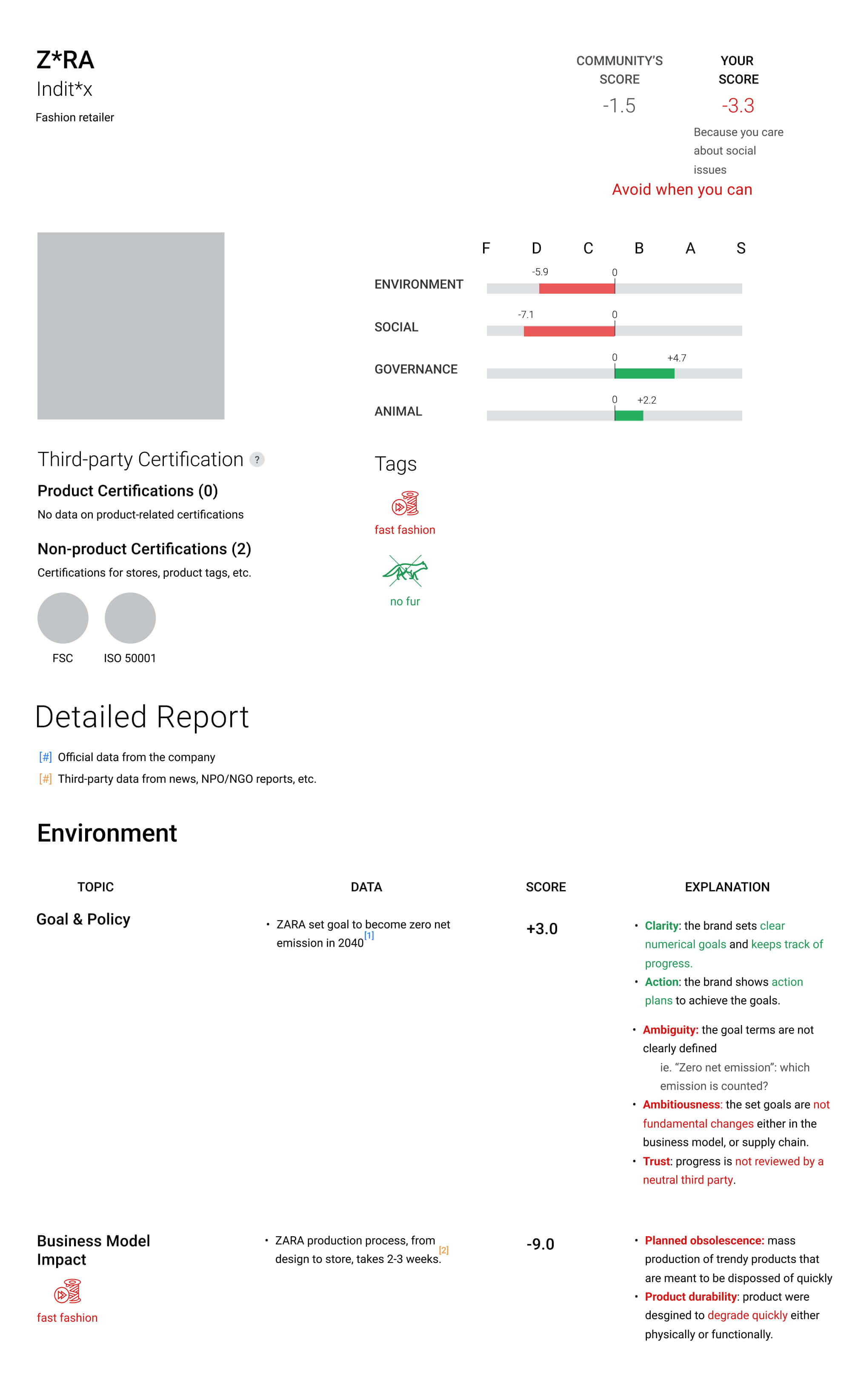 However, from user interviews, we found that although they are pleased to see a thorough analysis of how sustainable a company is, users just can't sacrifice so much of their time and effort on reading long texts to make a single sustainable purchase decision